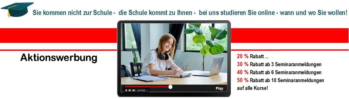 Ein Fernkurs ist ein bis zu 100 Prozent gestützter Onlinekurs. Hier studiert der Kursteilnehmer bei freier Zeiteinteilung von zu Hause aus. An unserer Bildungseinrichtung ist die Studienlaufzeit bei dieser Kursvariante variabel (minimale / maximale Studienlaufzeit). Der Studierende legt die Studienlaufzeit und das Tempo selbst fest. Die minimale Studienlaufzeit ist die Regelstudienzeit und ergibt sich aus der jeweiligen Stundenanzahl des gebuchten Kurses. Die Differenz zwischen minimaler und maximaler Studienlaufzeit ist gebührenfrei und kann vom Studierenden selbstständig festgelegt werden.